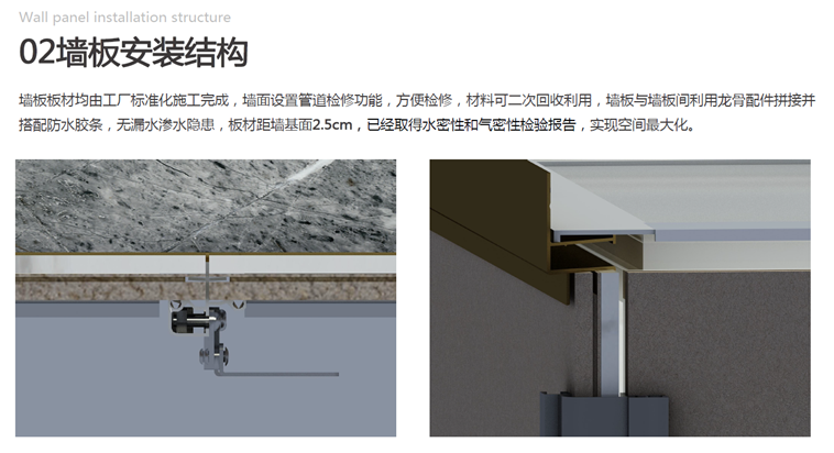 是通過對鋼板表面進(jìn)行處理后,按現(xiàn)場尺寸定制折彎加工的墻板標(biāo)準(zhǔn)化產(chǎn)品;并采用獨(dú)特的飾面扣裝連接方式,安裝簡易便利,不打釘,不打膠,連接穩(wěn)定牢靠,可拆卸回收。飾面材質(zhì)和式樣有豐富的選擇和搭配,石紋、木紋、壁紙、壁布、涂裝板,滿足各種類型的裝修風(fēng)格和設(shè)計(jì)需求。