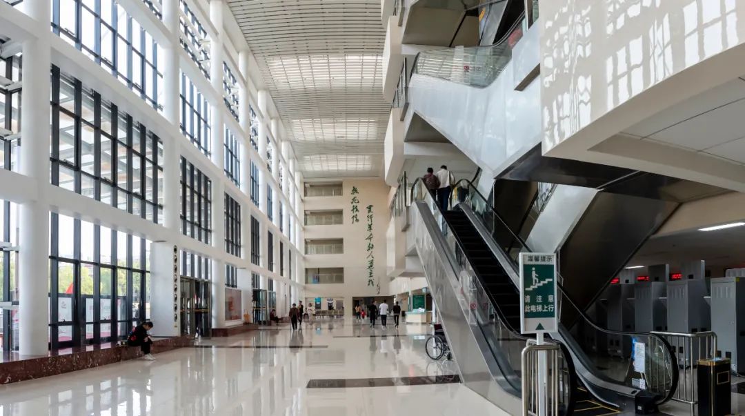 室內的水平通道、垂直通道要從功能的分布、各醫療流程進行梳理整合,選擇各種運輸梯臺數量與形式,從而提高醫院的整體運營效率。圖為上海市第六人民醫院門診醫技樓垂直電梯廳。